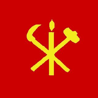 북한 노동당기=붉은색 바탕에 노란색의 촛불과 망치와 낫 그림