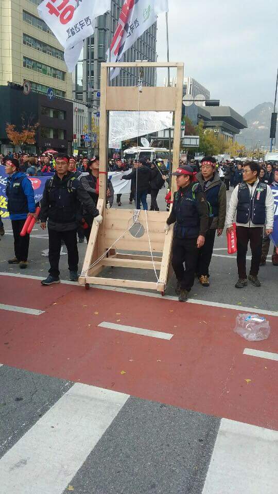 박근혜 대통령의 목을 자르겠다고 위협하는 단두대 모형