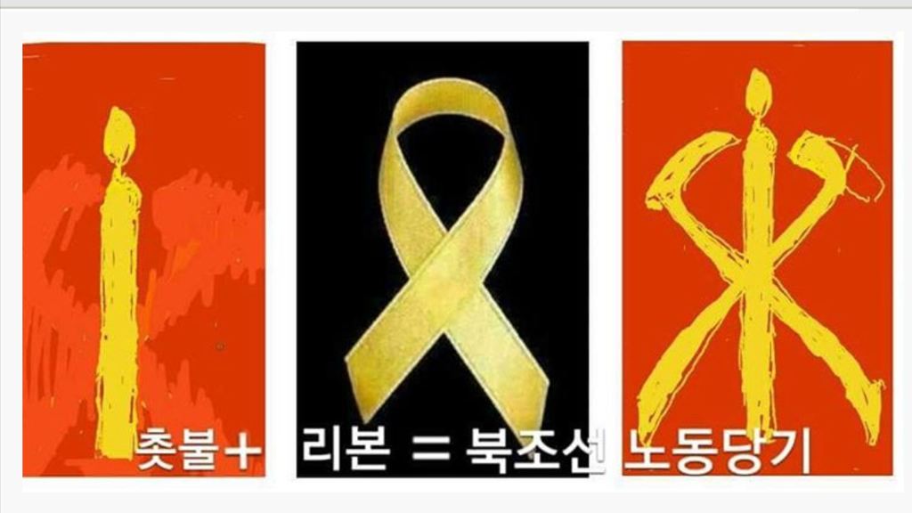 민중총궐기 현장의 촛불+X자로 겹친 노란색 리본=둘을 결합하면 북한 노동당기?