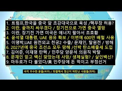 트럼프,한국을 중국 앞 초강대국으로 육성 '핵무장?'/이란 때문에 중국 빨리 망한다/尹,UAE서 600만배럴 원유확보/김어준, 이재명 탄핵/마두로가 다 불었다 '미국 민주당 뇌물'